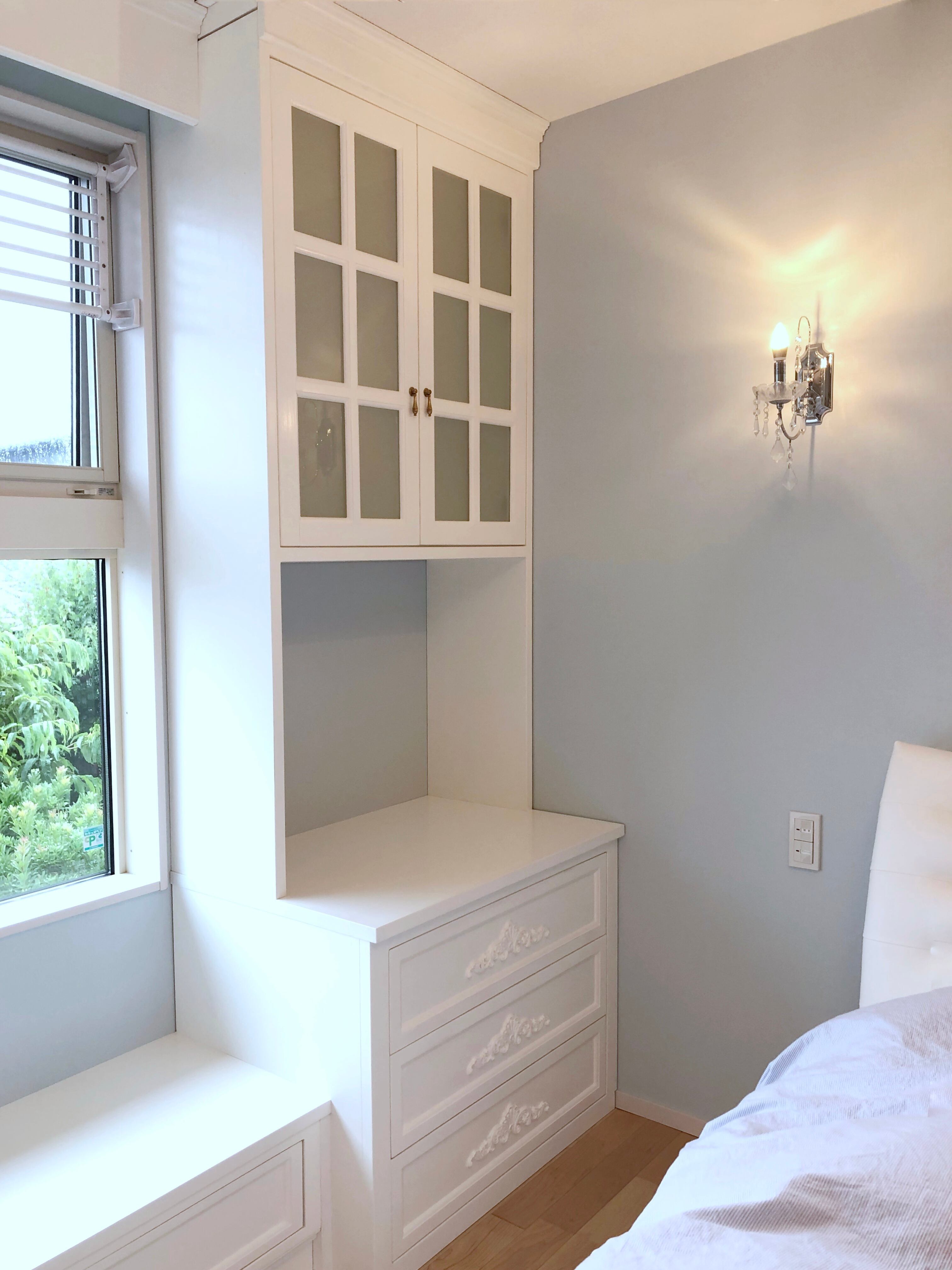 ・右はドレッサー、衣類の収納引き出しとすりガラスを入れた、飾り棚になります。
