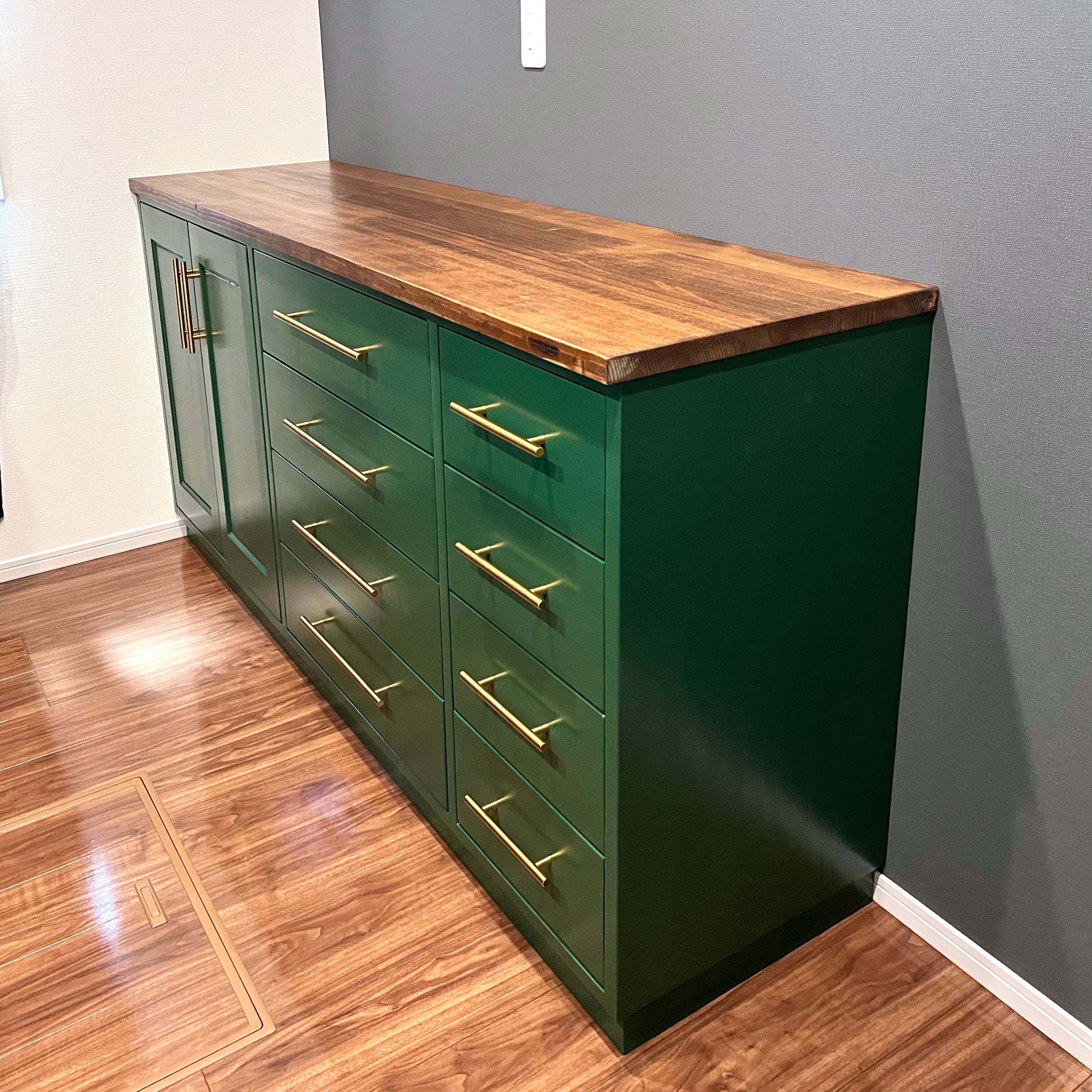 ディープグリーンキッチンカウンター キッチン収納 ダイニングボード